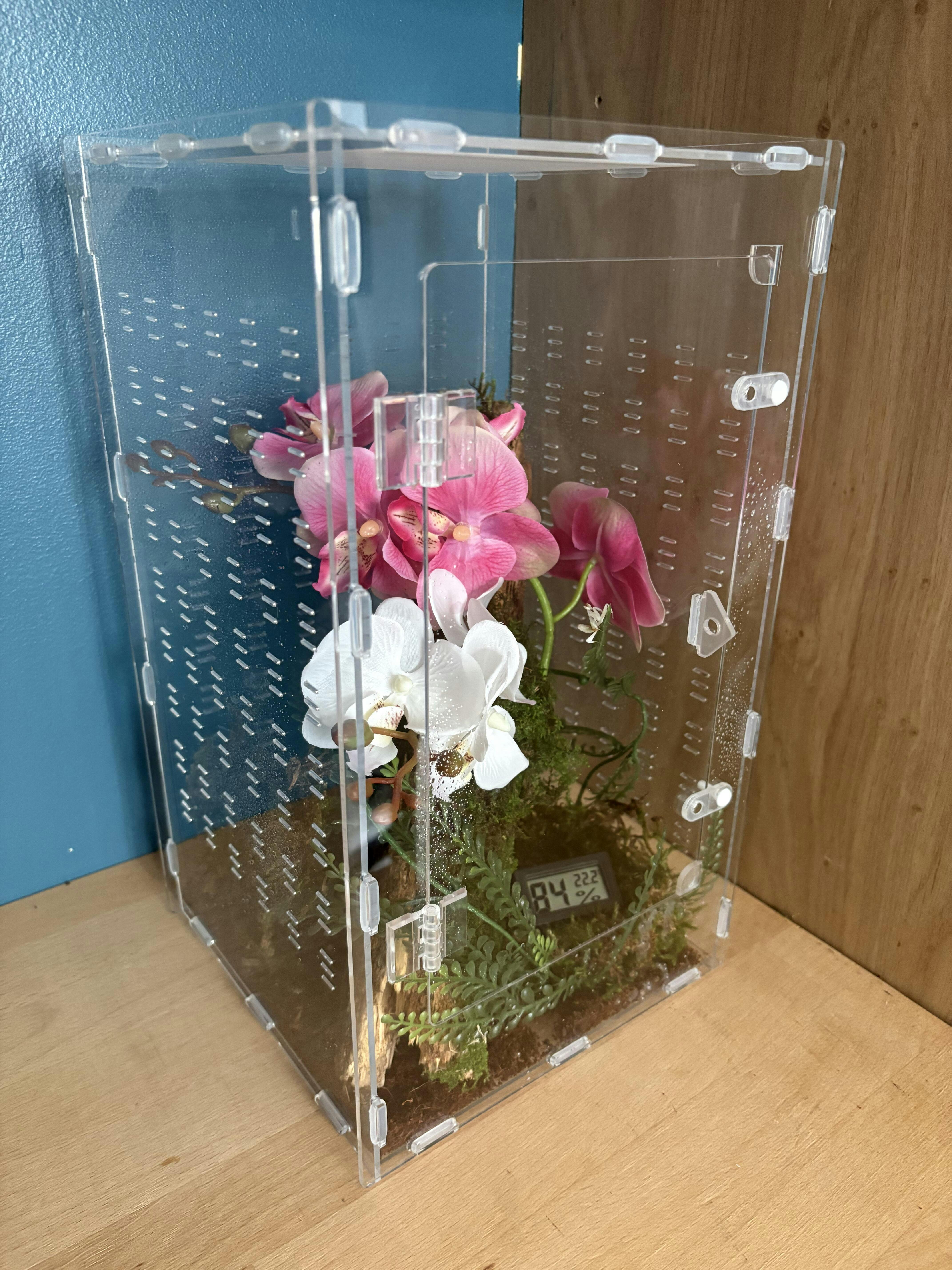 Le terrarium vertical favorise le comportement naturel des mantes, qui aiment grimper et se positionner sur les hauteurs, d'où une hauteur supérieure à sa largeur. J'ai spécialement choisi cette taille pour qu'elle s'adapte à l'immense majorité des mantes entre 4 et 12 cm. La porte frontale à charnières permet d’intervenir sans perturber l’animal, tout en limitant les risques de stress et de fuite.