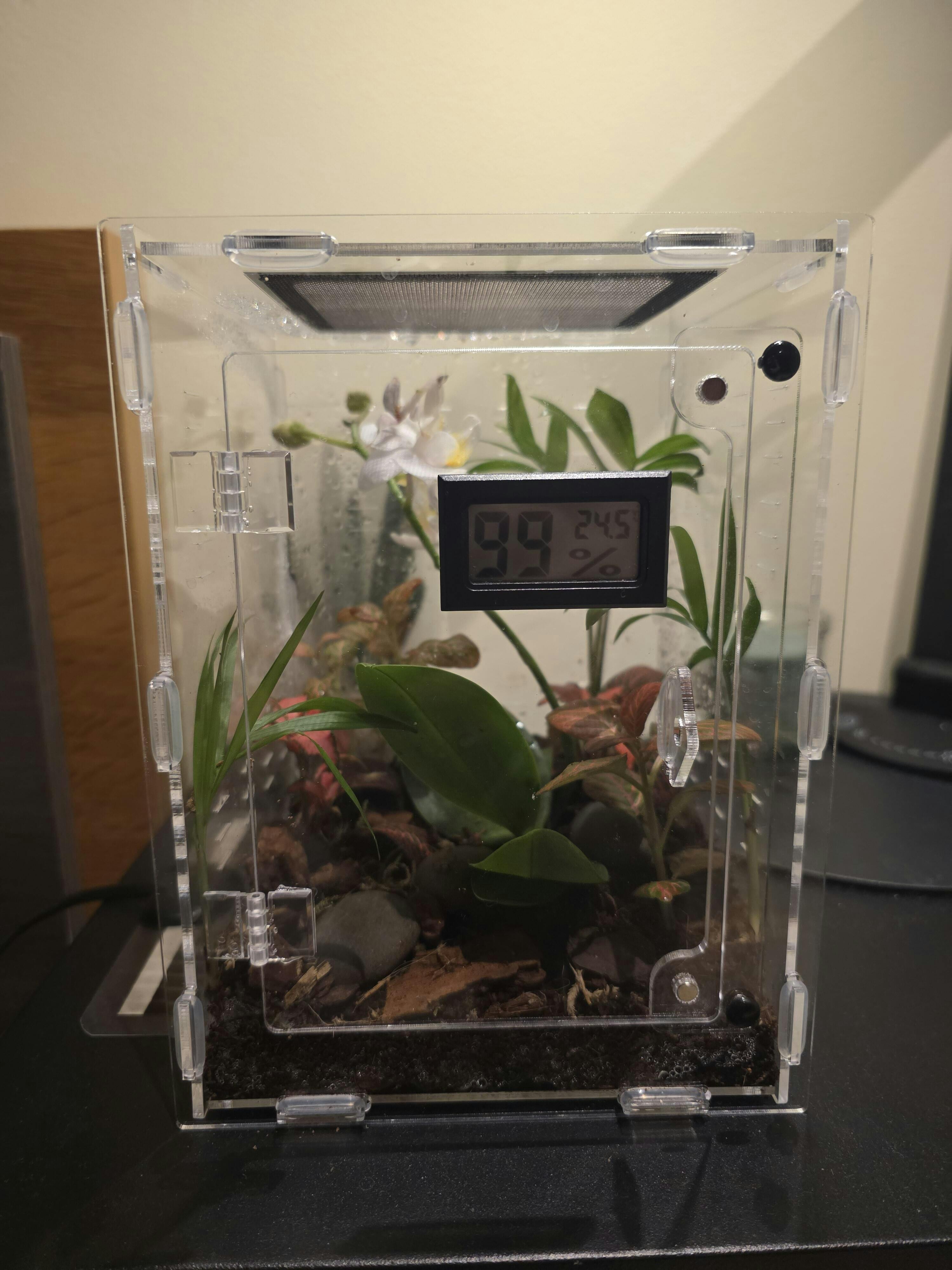 Ce terrarium est la deuxième version (avec une bonne dizaine de prototype entre deux mais ça ne compte pas 😁) de mon premier terrarium "spécial insecte/arthropode". Ceux-ci n'existant pas réellement sur le marché j'ai voulu combler ce manque en proposant une alternative vraiment créer pour nos petits protégés. Il combine surface d'escalade maximale, énorme aération et grande précision dans le design pour éviter toute fuite. J'espère que ça vous plaira.